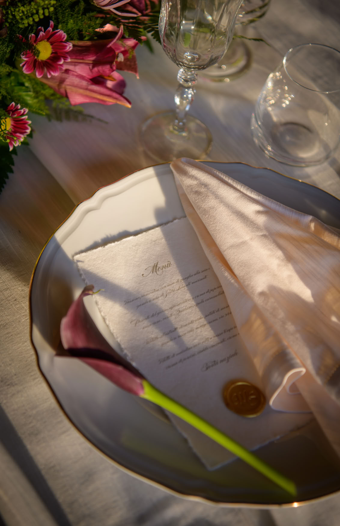 The atmosphere of the shoot was further enriched by the styling and décor curated by wedding planner Sonia Rienzo, who beautifully interpreted the concept of the project: the Italian wedding experience. A vision made of warmth, conviviality, natural materials, and refined details, where every setting becomes an emotional and sensory journey.